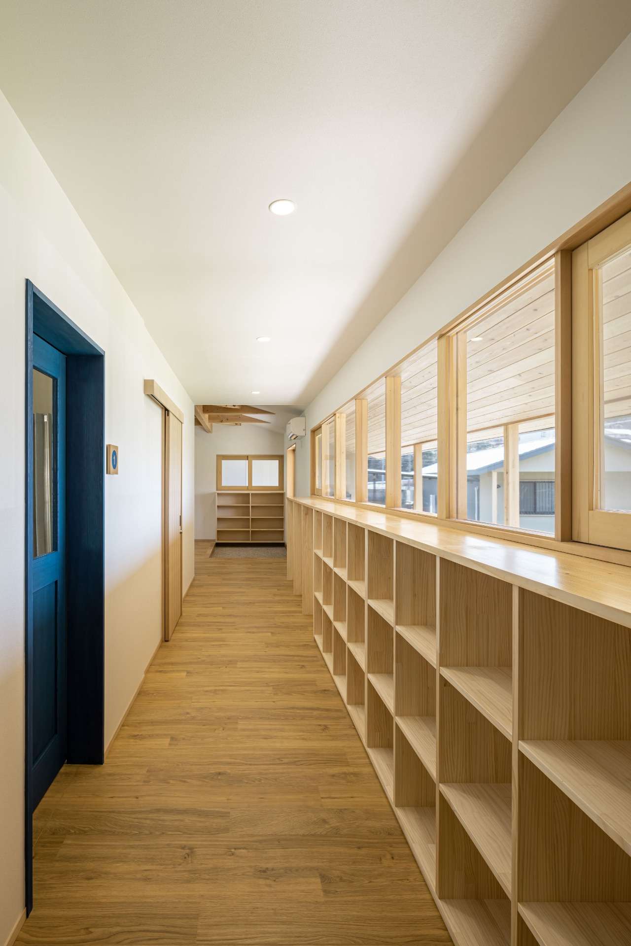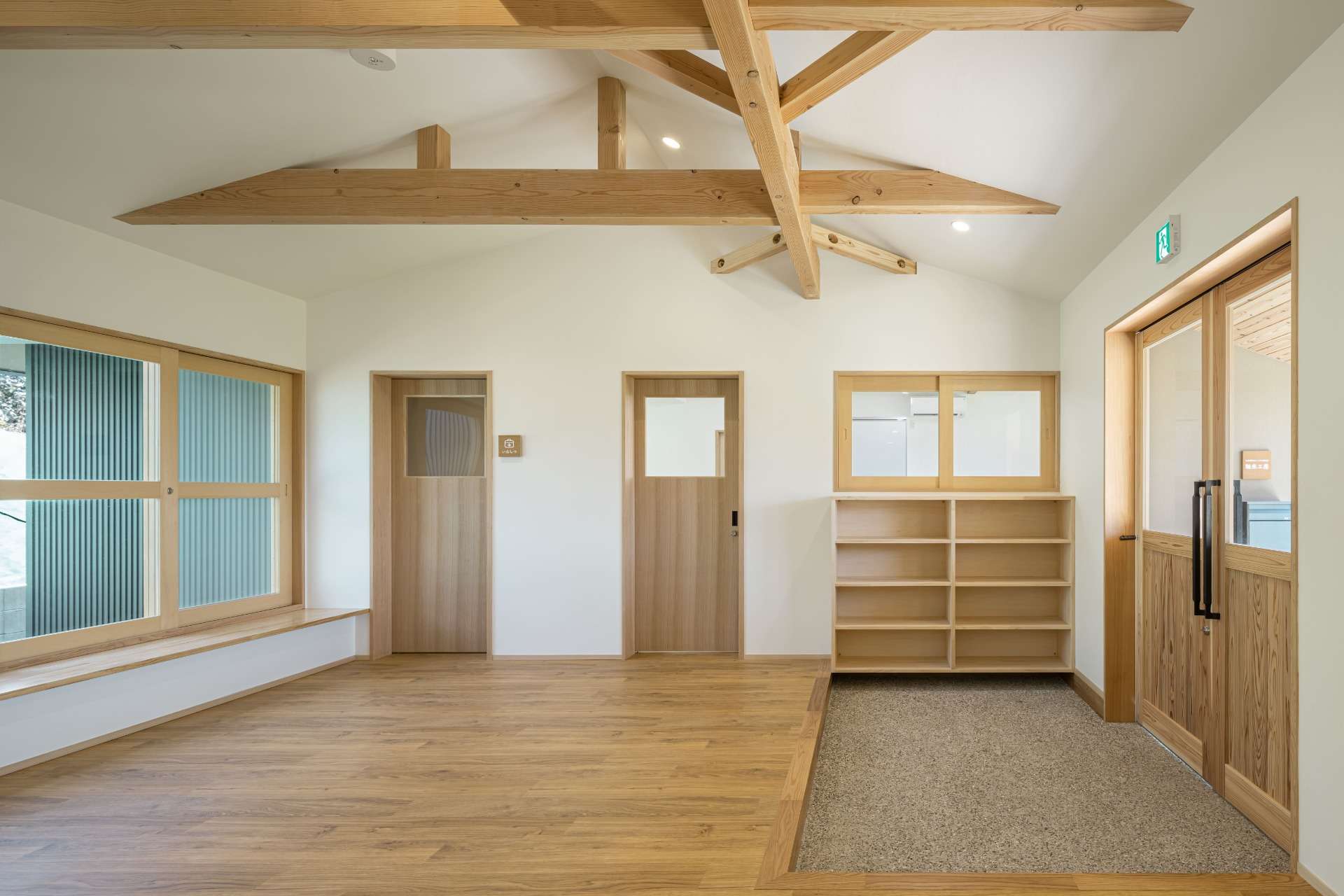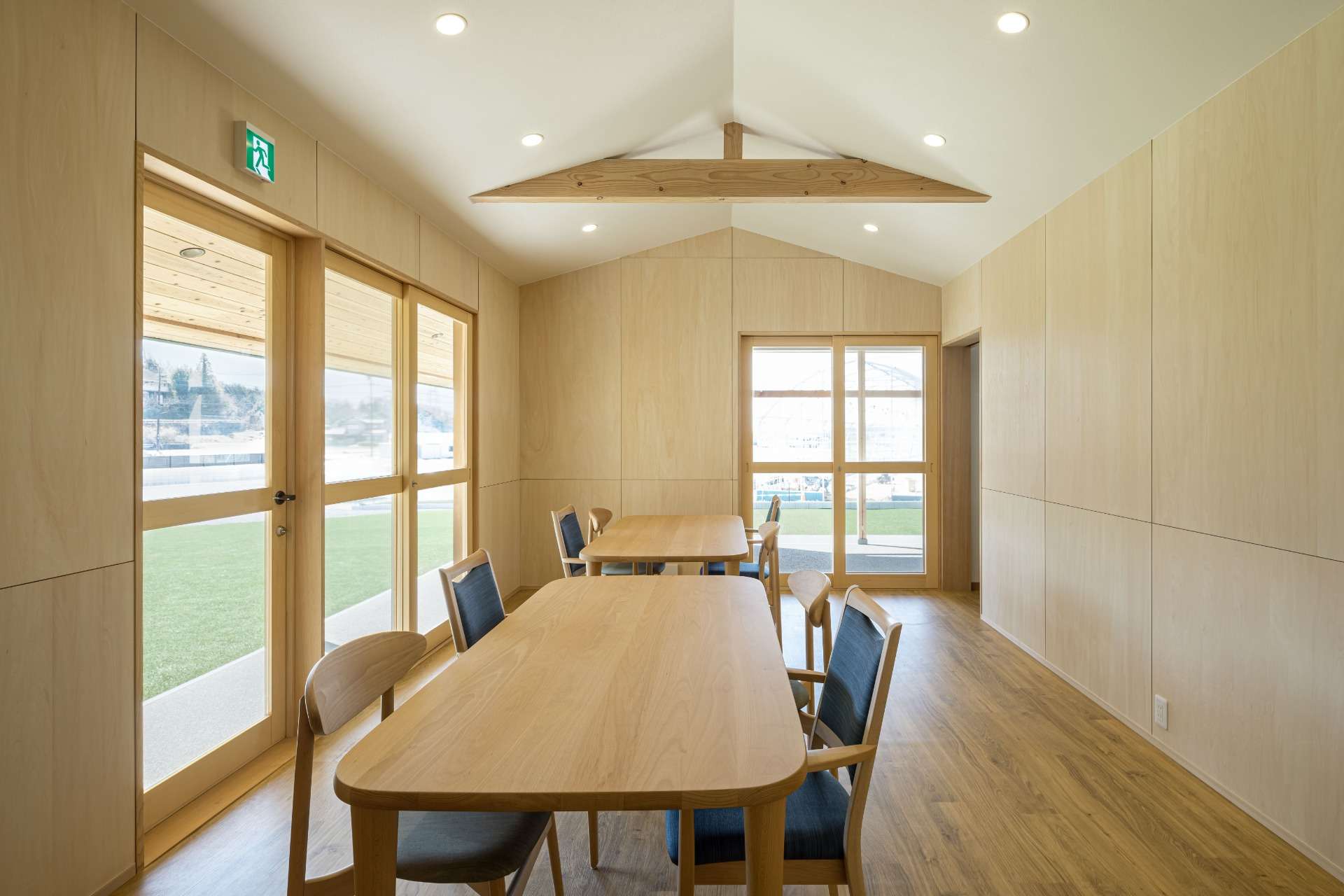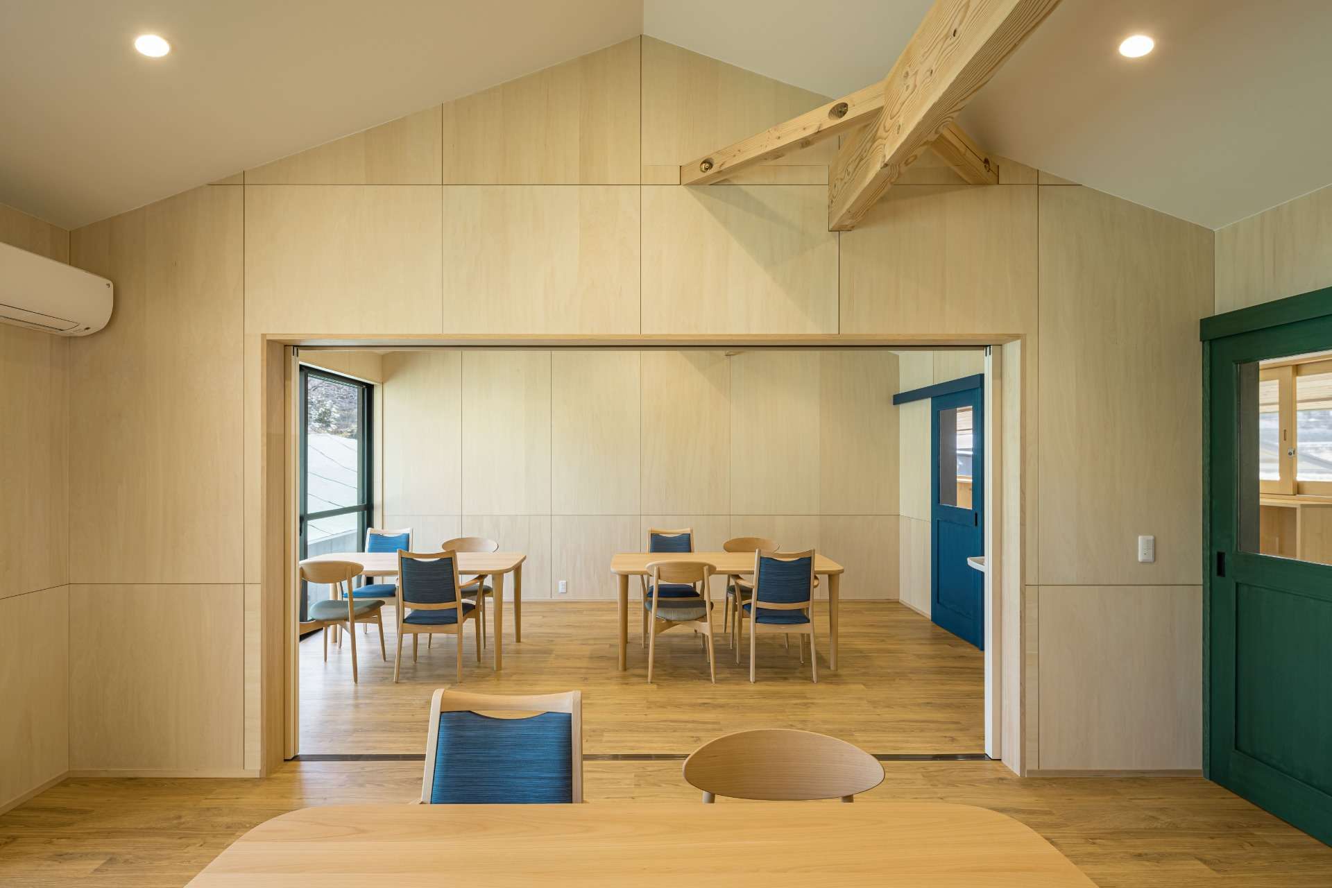 施設で過ごす利用者さんが落ち着いて快適に過ごせるよう、木をたくさん使った内観、外観、色遣いにしています。